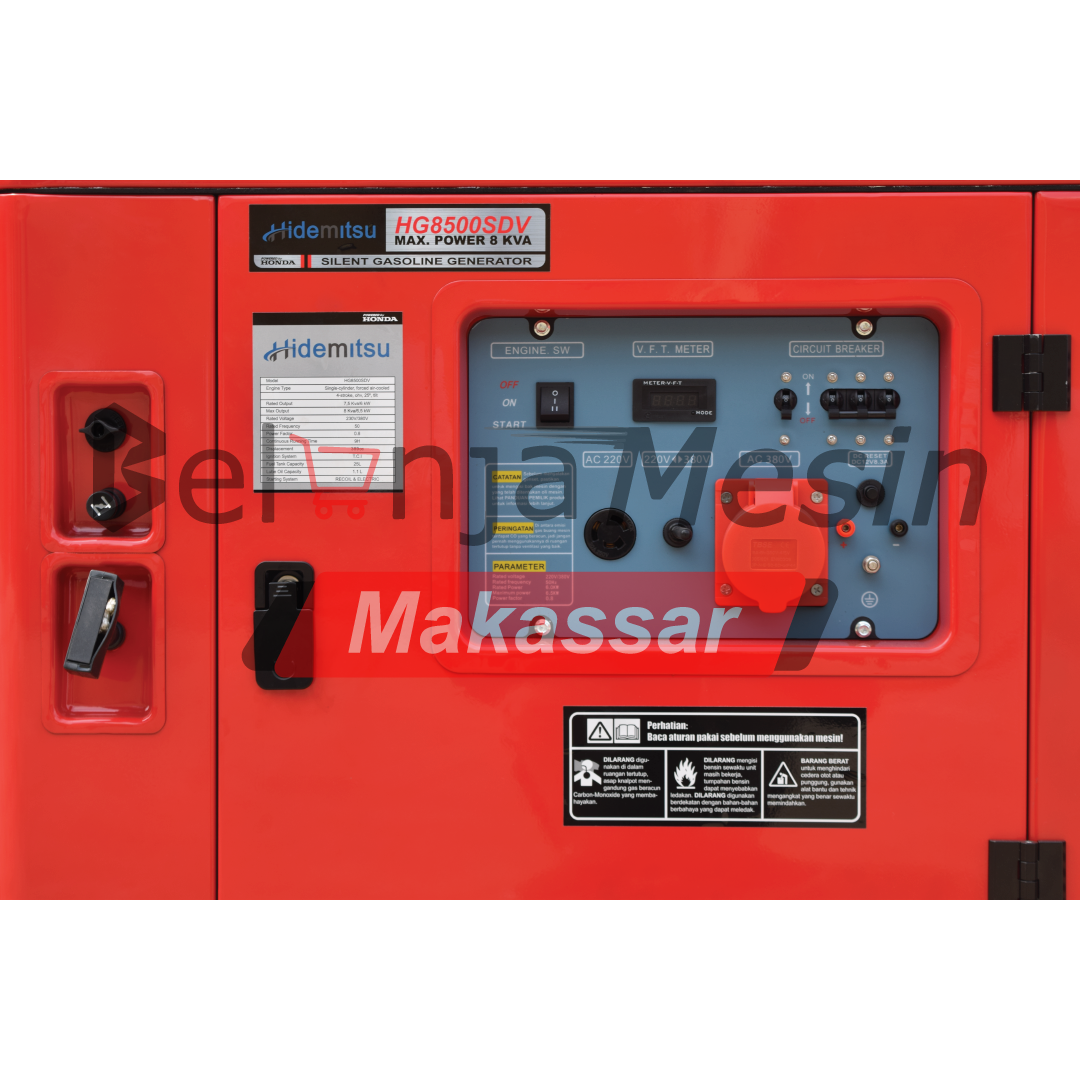 Genset Silent 7.5 Kva bensin hidemitsu HG 8500SDV genset bensin yang di pilih untuk kebutuhan listrik cadangan rumah, kantor kecil, toko atau usaha ringan dengan daya output 6000 watt. Dirancang silent dilengkapi dengan rangka bodi kedap suara sehingga lebih tenang dibandingkan model open , cocok untuk tempat tinggal atau area kerja yang tidak ingin terganggu oleh kebisingan mesin.