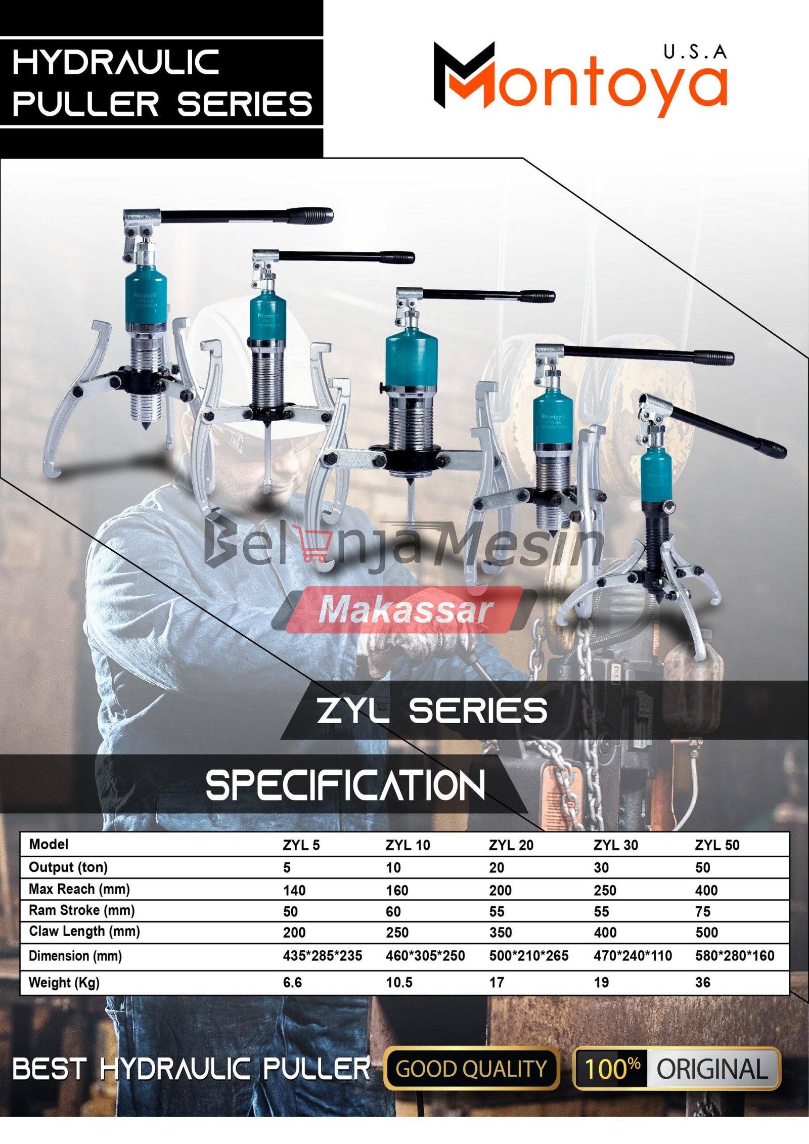 Montoya Hydraulic Puller ZYL Series adalah alat penarik hidrolik berkualitas tinggi yang digunakan untuk melepas bearing, gear, pulley, dan komponen mesin lainnya secara aman dan presisi. Menggunakan sistem hidrolik manual dengan tenaga besar, ZYL Series mampu memberikan daya tarik stabil tanpa merusak komponen. Cocok untuk industri, bengkel, dan perawatan mesin berat.