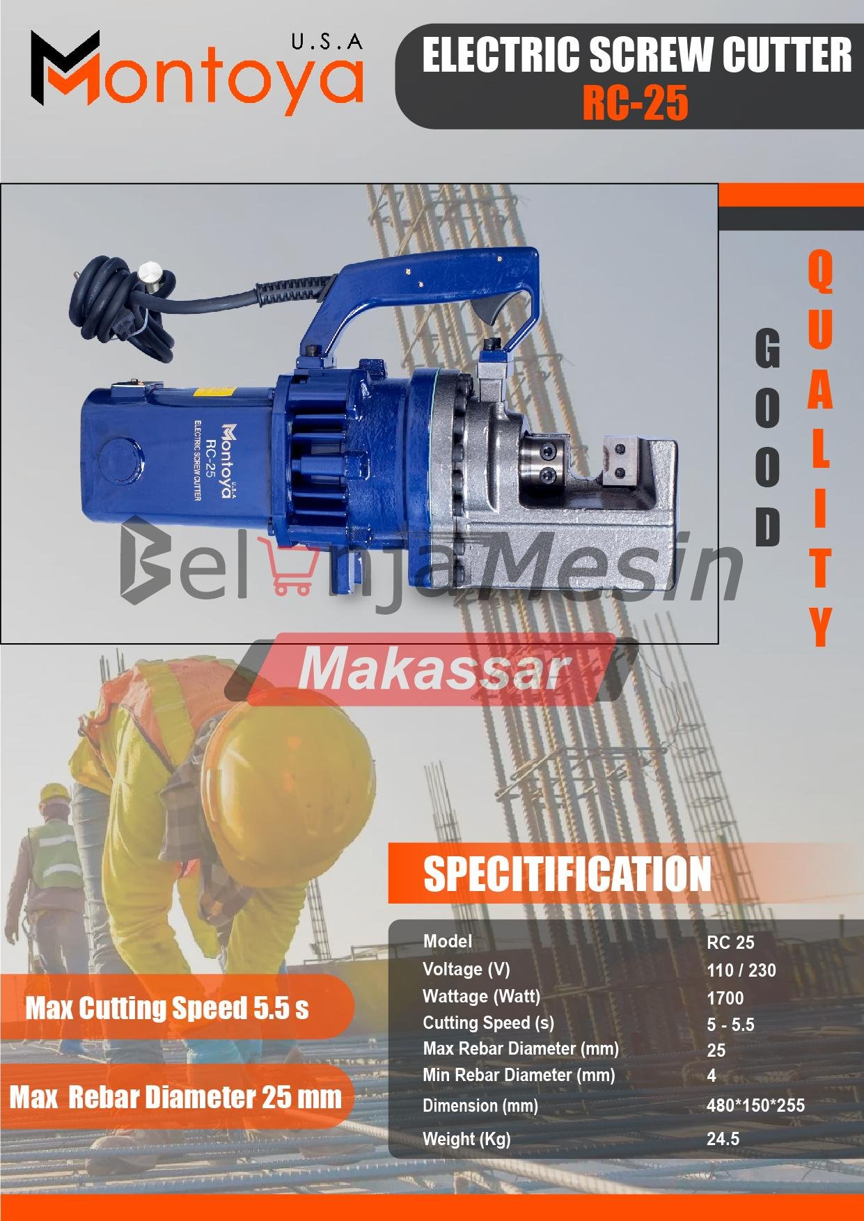 Mesin potong besi beton Montoya RC-25, mampu memotong diameter hingga 25mm dengan kecepatan 5-5.5 detik. Ditenagai motor 1700 Watt, cocok untuk proyek konstruksi berat. Dual voltage 110/230V, berat 24.5kg, desain compact dan kokoh.